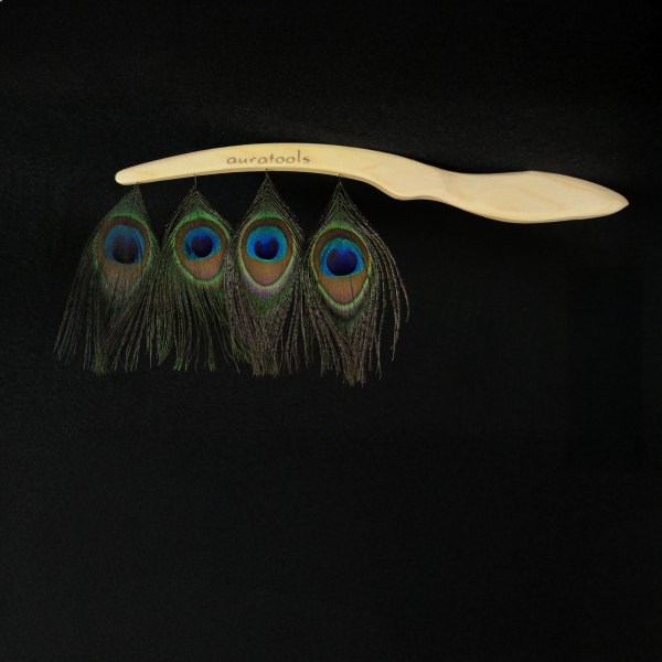 Die kleinen Aurakämme mit Pfauenfedern sind in unserer Erfahrung besonders hilfreich bei akuten Belastungen im Gedanken- und Bewußtseinsspektrum der Aura. Sie werden vor allem im Gesichtsbereich (zur Reinigung der Chakren) verwendet.